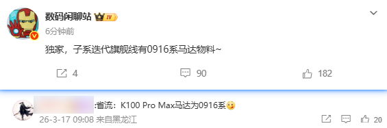 【CNMO科技音问】3月17日,数码博主“数码谈天站”爆料称开云体育(中国)官方网站,某款迭代子系旗舰手机或将配备0916马达。据网友估量,这款新机可能为REDMI K100 Pro Max。
